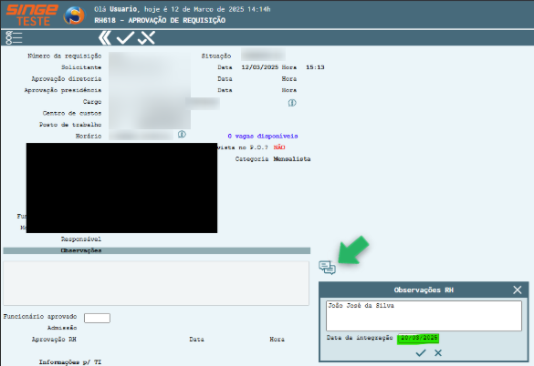 O campo de data de integração foi incorporado dentro do campo "Observação RH". Ao acessar o detalhe de uma requisição pendente, o campo "Observações RH" permite registrar anotações sobre a vaga e, ao mesmo tempo, informar a data prevista para integração do novo colaborador (conforme imagem abaixo).