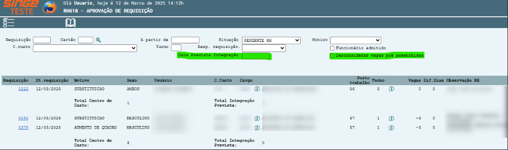Na operação diária, ao acessar a RH618 para aprovar requisições de vagas, o gestor pode utilizar os filtros disponíveis para localizar as requisições pendentes de sua aprovação, verificar na listagem as informações de cada vaga (incluindo observações do RH e data de integração prevista), selecionar as requisições que deseja aprovar e efetuar a aprovação em lote pelo botão na barra superior. Para vagas que ainda não possuem data de integração definida, o filtro "Desconsiderar vagas pré preenchidas" permite visualizar exclusivamente as requisições que ainda precisam de definição, agilizando o acompanhamento das pendências.