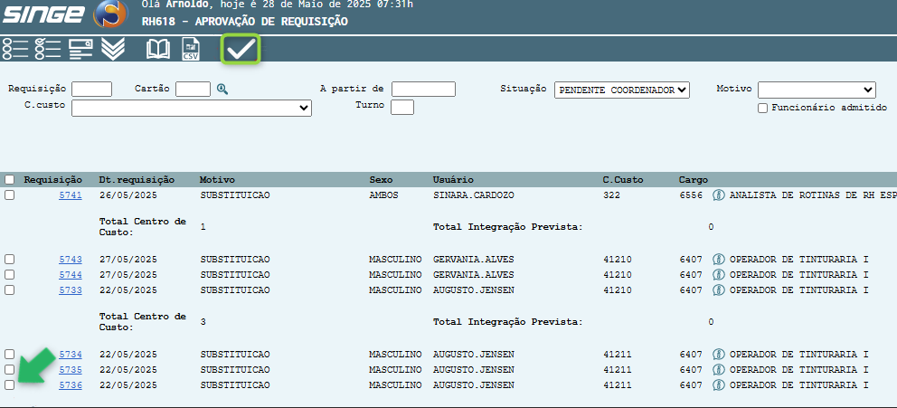 Nesta tela, consultamos as requisições pendentes de aprovação.