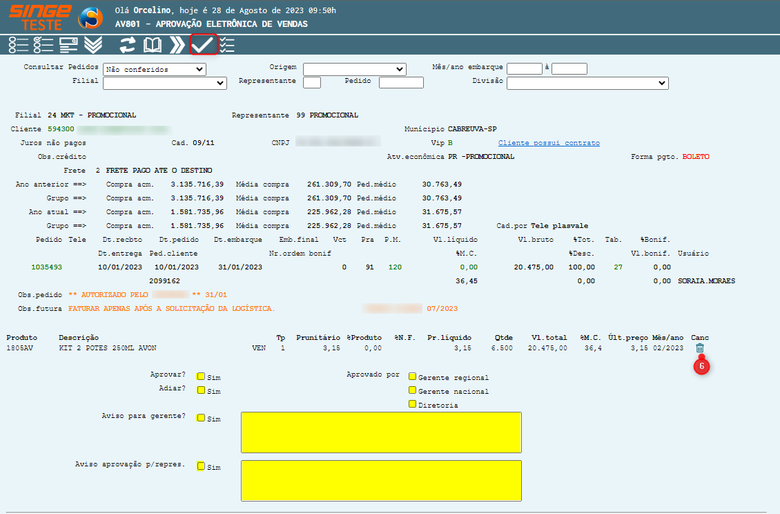 Nesta tela, realizamos as aprovações de pedidos e também o cancelamento de itens do pedido.