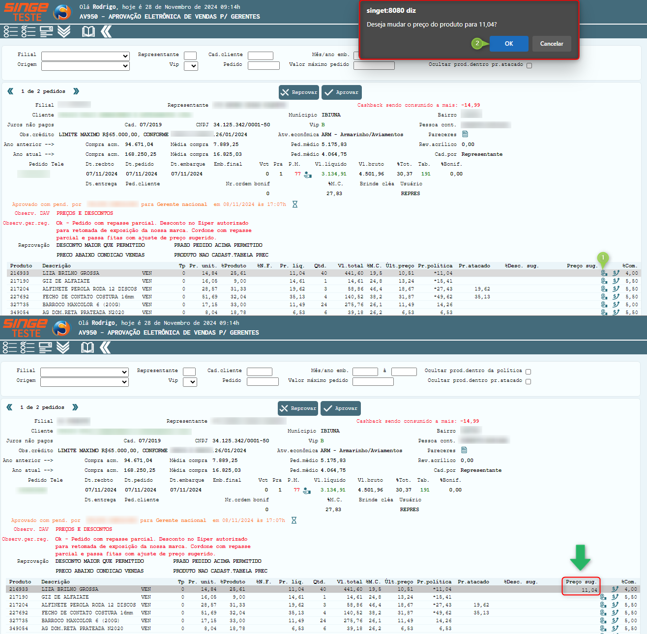 caso deseja prosseguir com a alteração; após será mostrado o valor alterado no canto direito da linha do produto e ao efetuar uma nova consulta