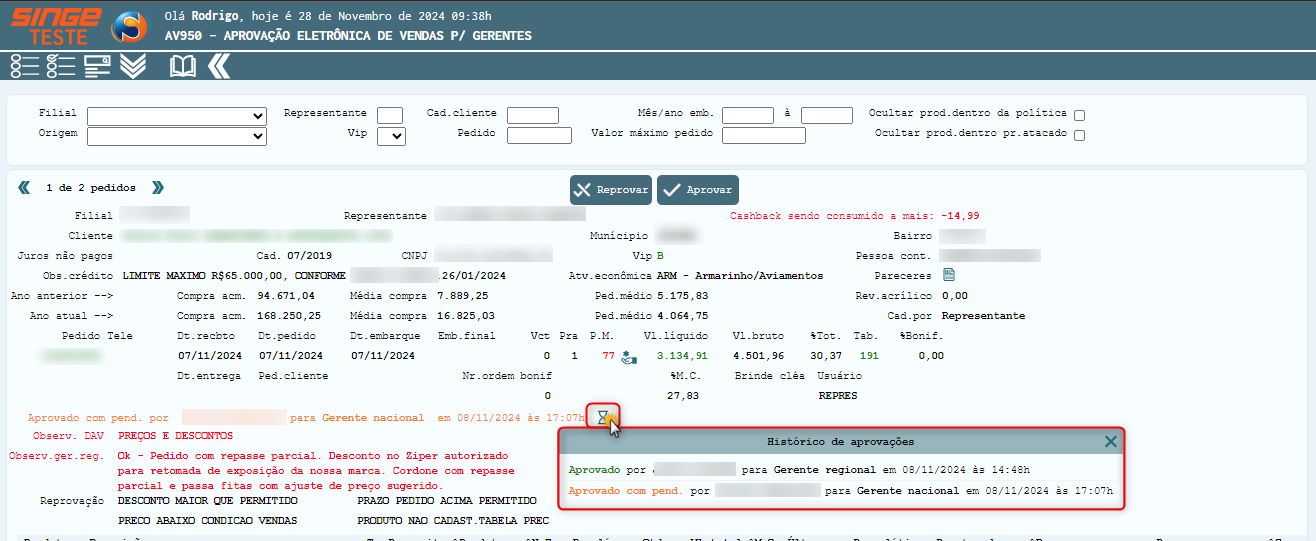 Este procedimento tem como objetivo exemplificar como efetuar a consulta, filtragem, aprovação e reprovação de vendas para gerentes dentro do sistema Singe.