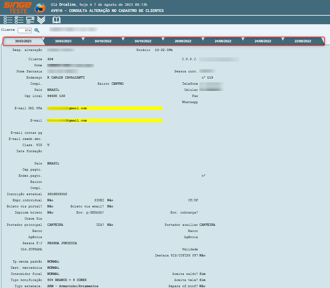 Nesta tela, realizamos a consulta de todas as alterações realizadas no cadastro de um cliente.