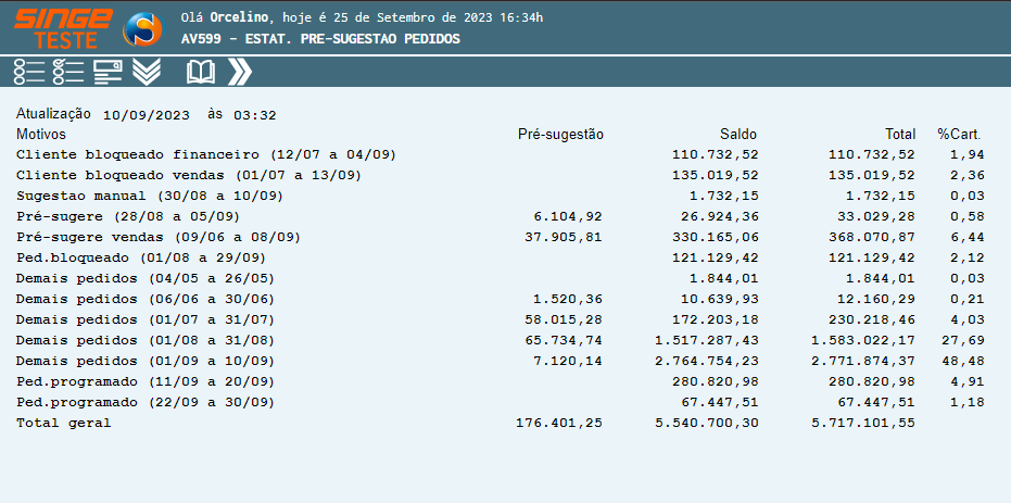 Nesta tela, consultamos as estatísticas de pré sugestão dos pedidos, para avaliação da carteira.