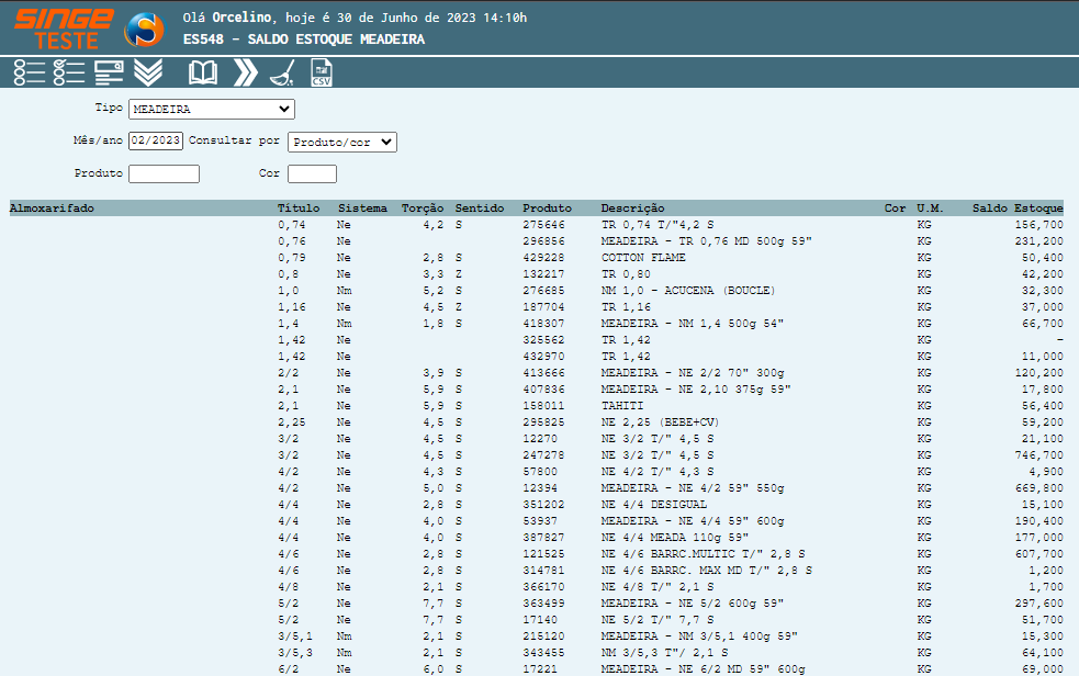 Nesta tela, consultamos o saldo de estoque, no setor de meadeiras, com os tipos de produto: Meadeira, Aro, Rocadeira, Industrialização.