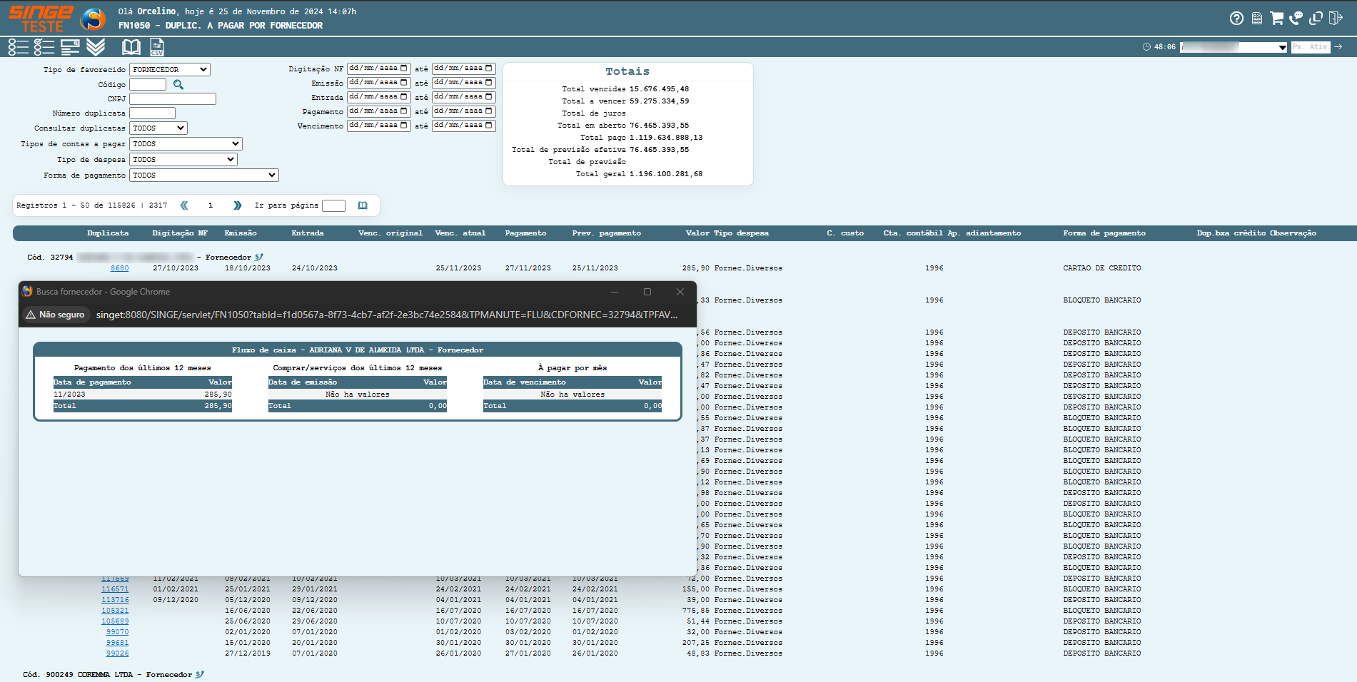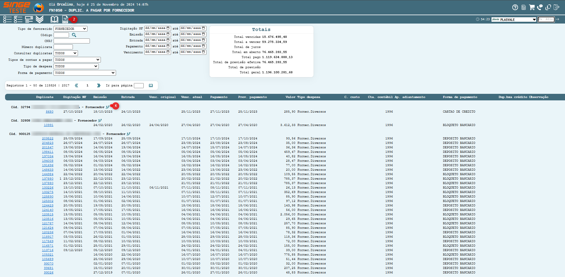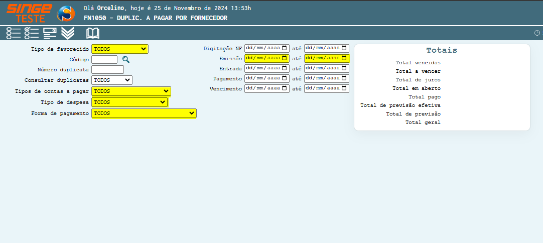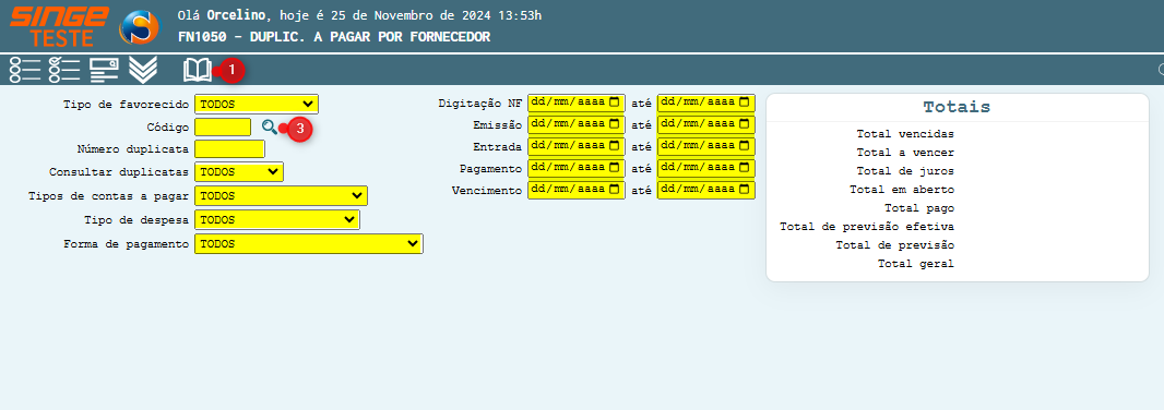 ![]() Figura 2: Tela FN1050 – Duplicata a Pagar por Fornecedor