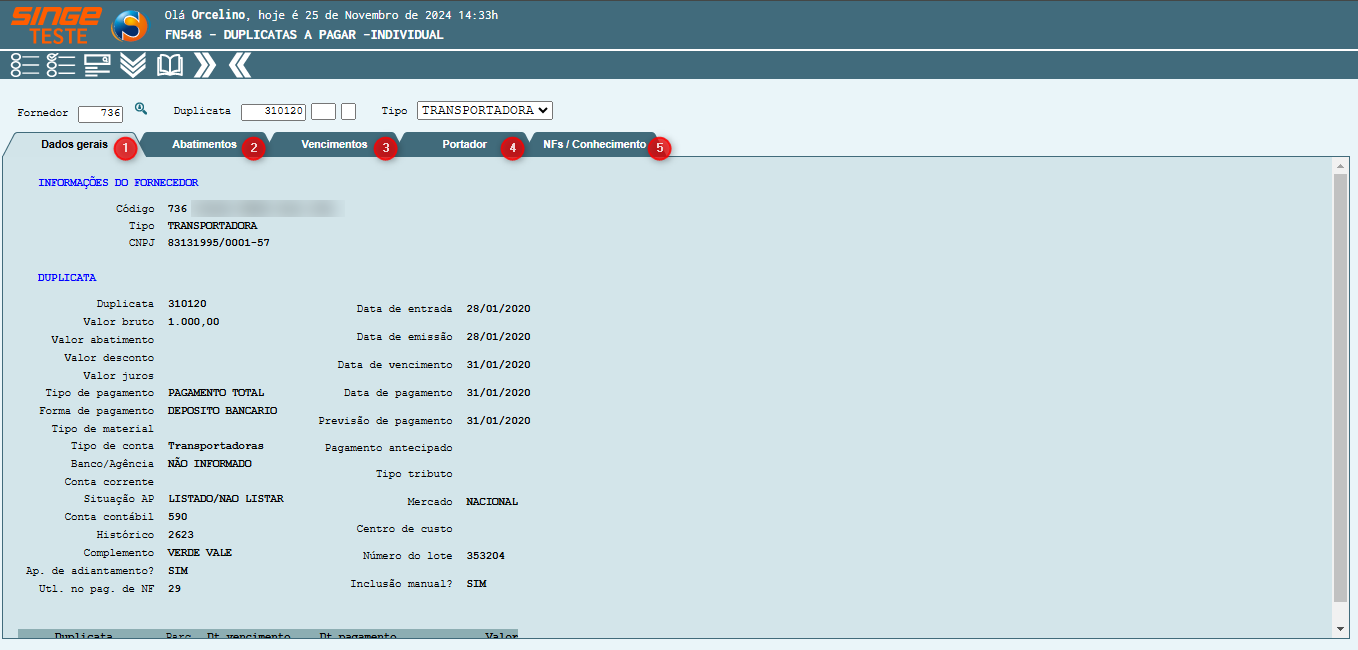 Esses filtros podem ser usados para pesquisa de AP’s. Clicando sobre o número da duplicata, a tela será redirecionada para a FN548 - Duplicatas a Pagar - Individual, onde os dados serão dispostos em 5 abas: