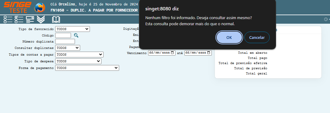 Caso tente realizar uma consulta, sem parametrizar ao menos um filtro, o sistema emitirá uma mensagem de advertência, alertando que esse tipo de consulta pode ser muito demorado.