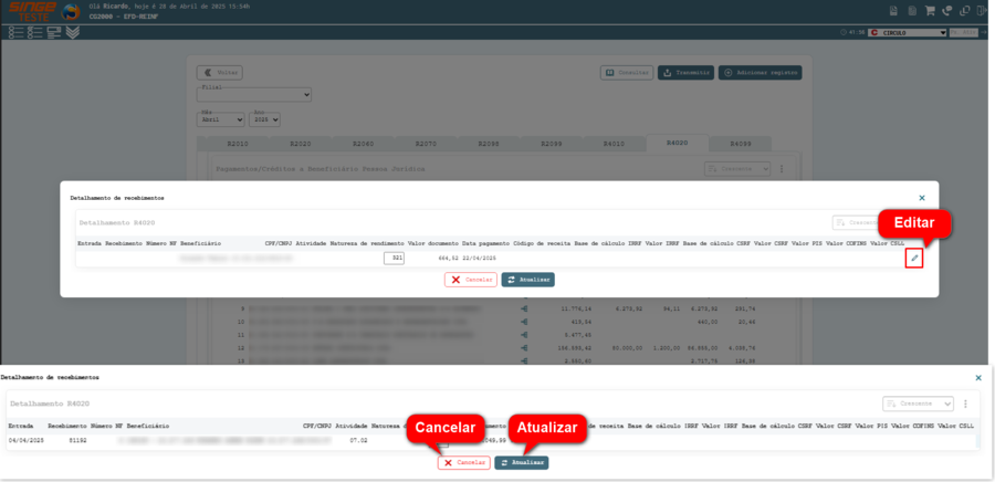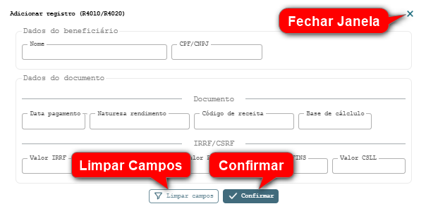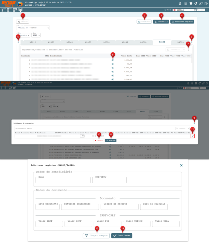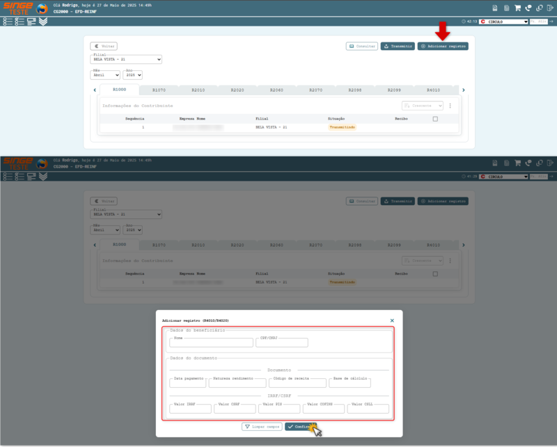 A CG2000 ainda contempla, a inclusão de informações que não tenham sido importadas por outros módulos. Nos eventos R-4010 e R-4020 está disponível o botão “Adicionar registro”, situado na mesma posição superior direita. Ao selecioná-lo, surge um formulário em que se informam dados como data, valor, natureza de rendimento e identificação do fornecedor. Uma vez gravado, o novo item passa a compor a grade principal. Para corrigir ou excluir esse lançamento, o usuário retorna ao botão “Visualizar recebimentos”, escolhe “Editar lançamentos” na janela que se abre, efetua os ajustes necessários e confirma; a atualização é refletida imediatamente na lista.