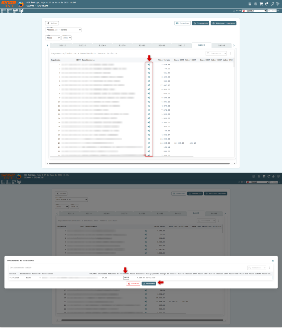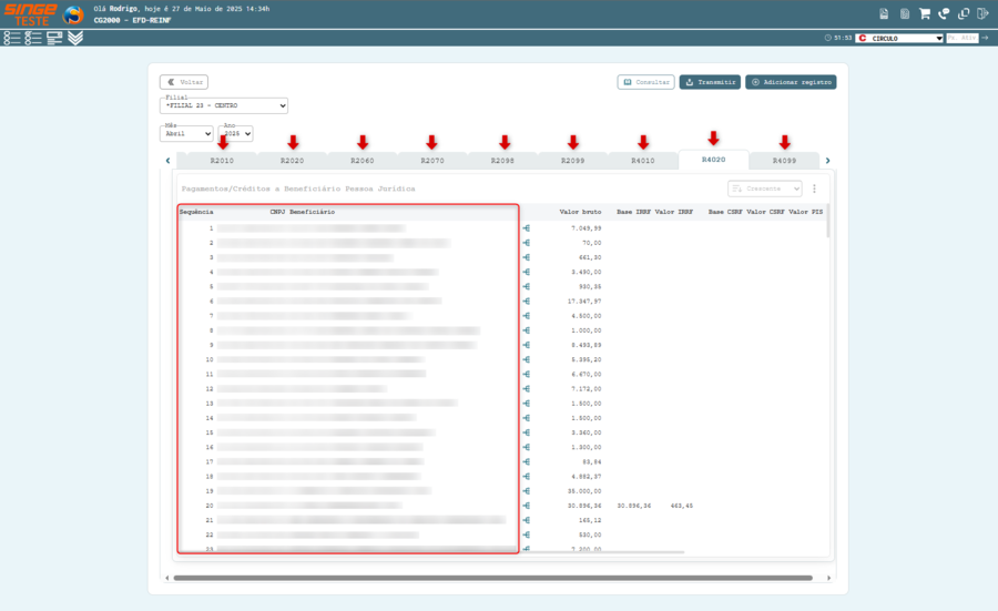Assim que você confirma o filtro, a área central da tela se organiza em abas horizontais; cada aba corresponde a um tipo de evento (R-1000, R-2010, R-4010, R-4020 e assim por diante). Dentro da aba ativa, os registros são exibidos em grade, já agrupados pelo CPF ou CNPJ do fornecedor ou prestador. Esse agrupamento facilita a leitura porque todos os recebimentos vinculados ao mesmo contribuinte permanecem lado a lado, eliminando a necessidade de filtrar novamente ou conferir lançamentos dispersos.