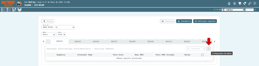 Com os devidos ícones apresentados, podemos partir para a apresentação e utilização das abas da atividade; desta forma, ao abrir a tela CG2000 pela primeira vez, você se depara com um ambiente concebido para concentrar todo o fluxo de trabalho dos eventos da EFD-Reinf em uma única interface. A navegação inicia-se de modo objetivo: no topo da página há apenas dois campos de pesquisa, Filial e Ano/Mês; informando a unidade da empresa e o período desejado o sistema recupera, em poucos segundos, todos os eventos registrados nesse intervalo. Esse filtro constitui a única porta de entrada, eliminando dúvidas quanto aos critérios de consulta.