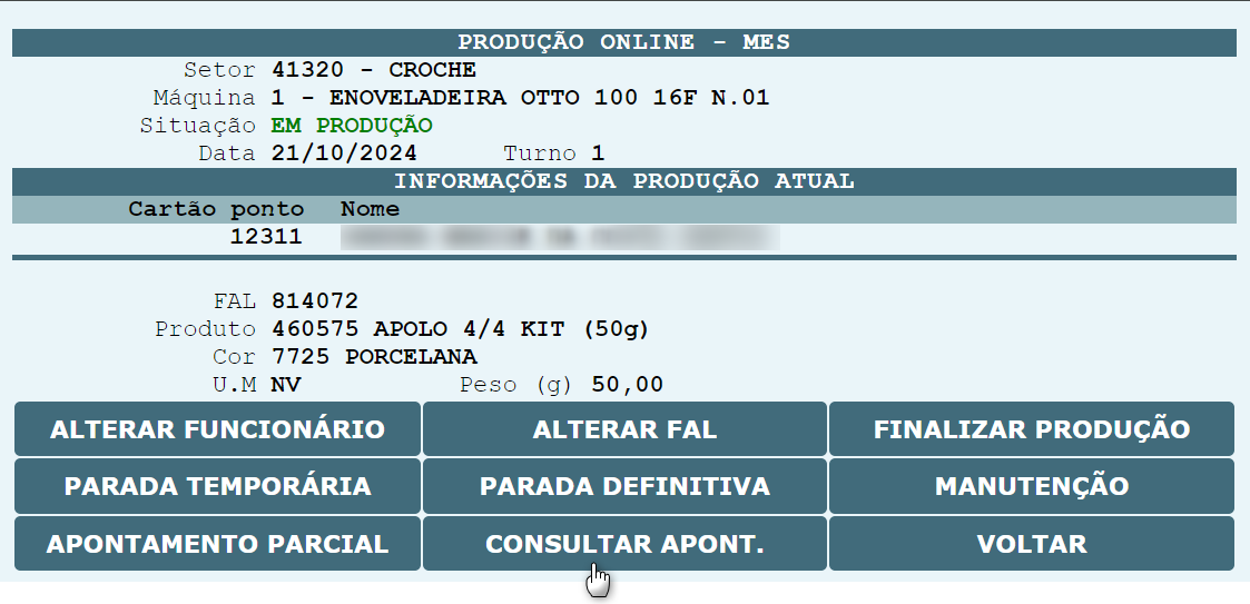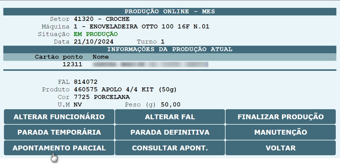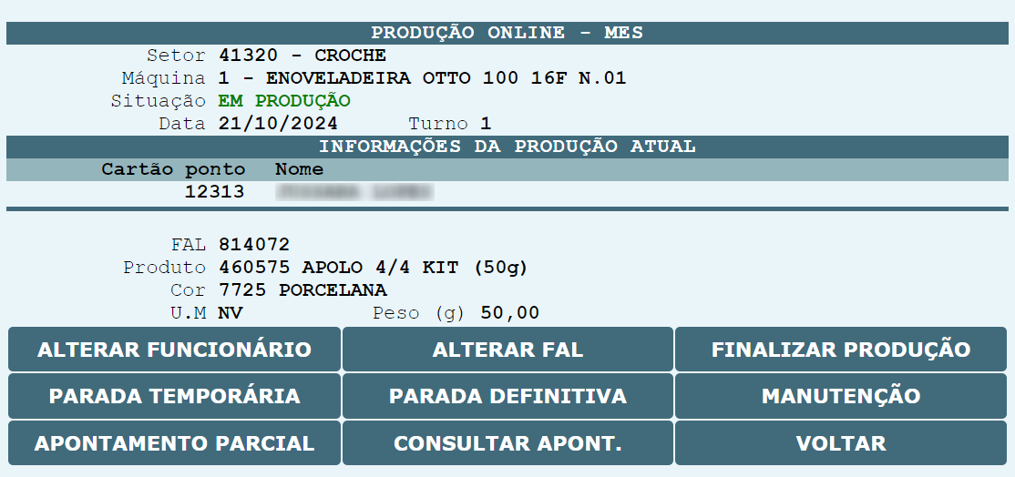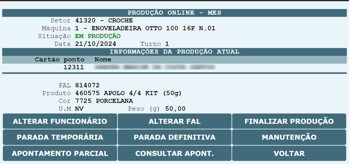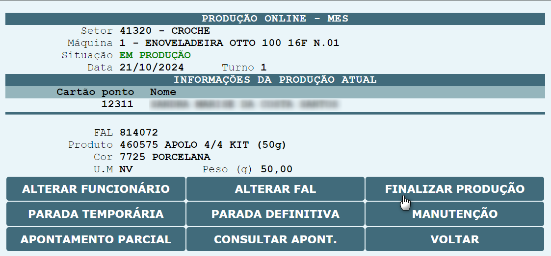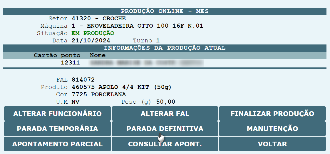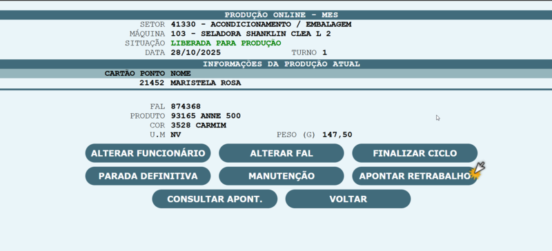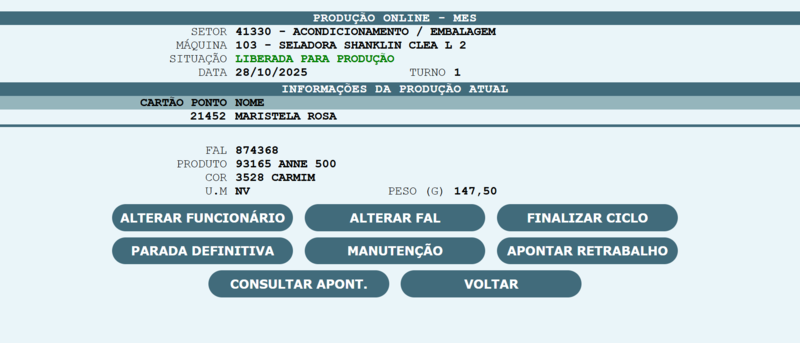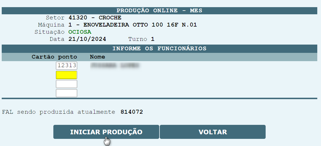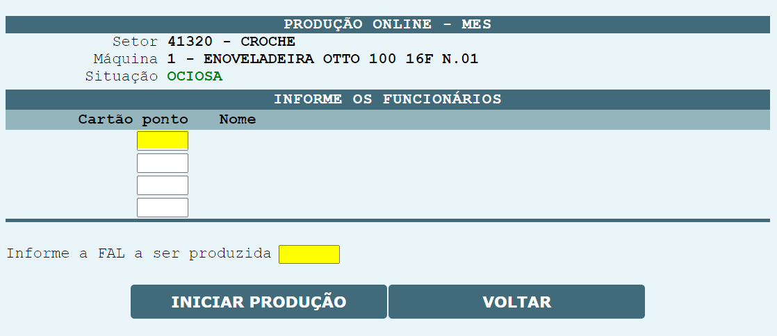 , o sistema será redirecionado para que o cartão ponto do operador possa ser informado, assim com a FAL que será produzida na máquina.