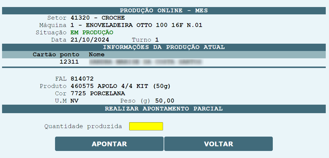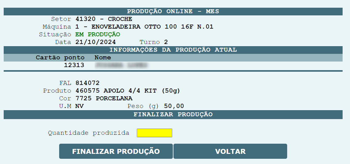 , uma nova guia será exibida para que a quantidade produzida, possa ser informada, para que outro funcionário possa dar continuidade a produção.