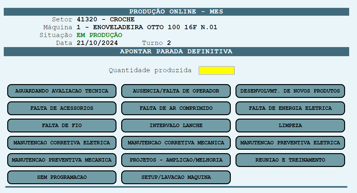 Com a máquina “em Produção”, teremos as seguintes opções de apontamento: