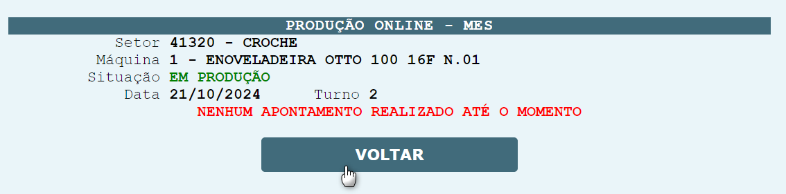 Ao clicar, o sistema processará o apontamento com a quantidade contada pela placa e encerrará a produção, deixando a máquina em situação "OCIOSA" (similar à Figura 7 ), pronta para um novo setup ou início de produção.