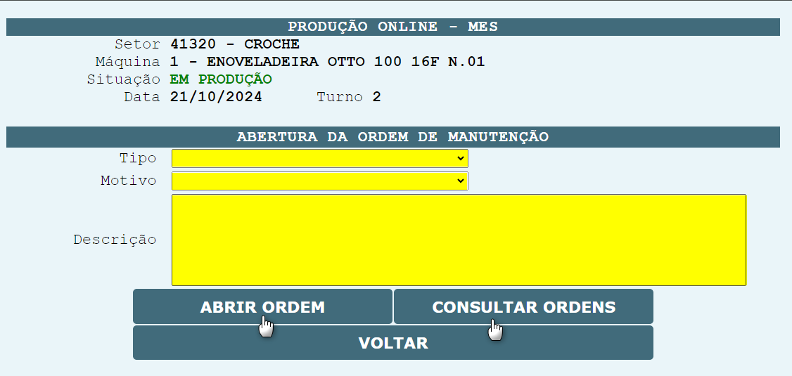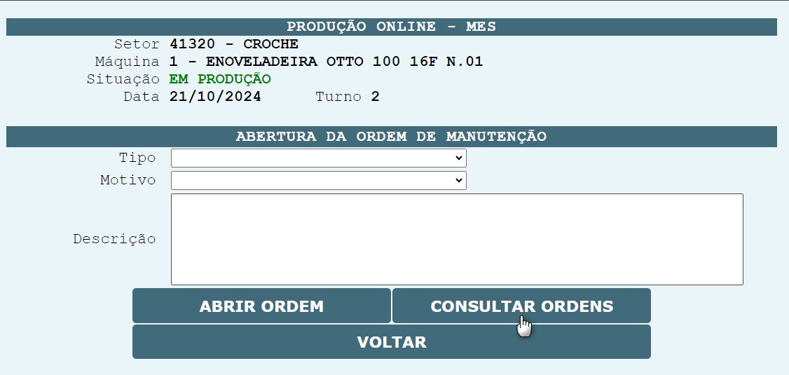 Para consultar as ordens de manutenção, abertas para a máquina, basta clicar sobre o botão