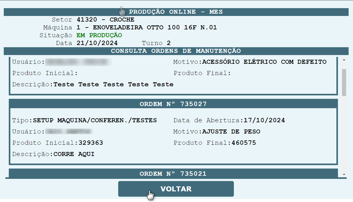 Uma nova guia será aberta, com a lista de ordens de manutenção, abertas para a máquina em questão.