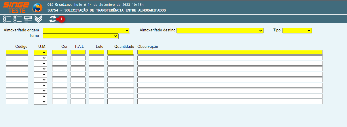 Nesta tela, abrimos as solicitações de transferência entre os almoxarifados, cadastrados no sistema.