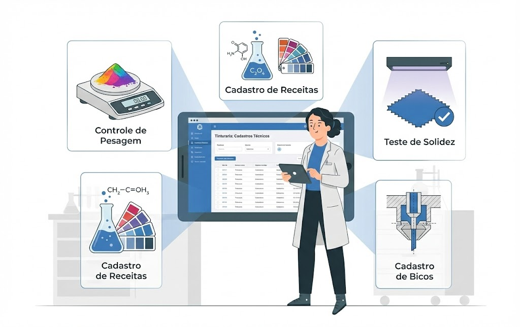 O submódulo Cadastros Técnicos funciona como a base de engenharia do setor de Tinturaria. É nesta etapa que são definidos todos os parâmetros, fórmulas e padrões de qualidade que guiarão o processo produtivo, garantindo a reprodutibilidade exata das cores e a padronização técnica das operações.